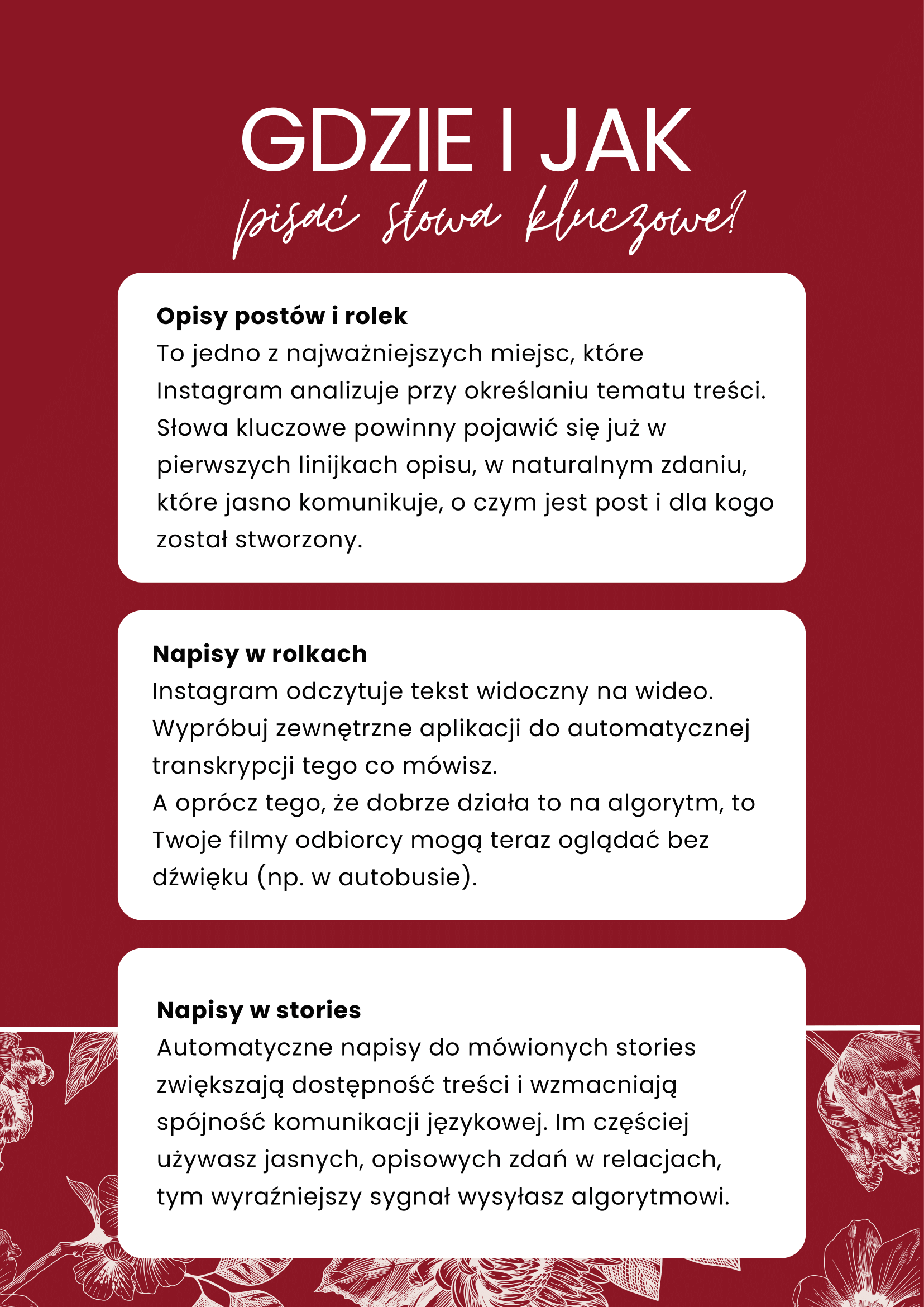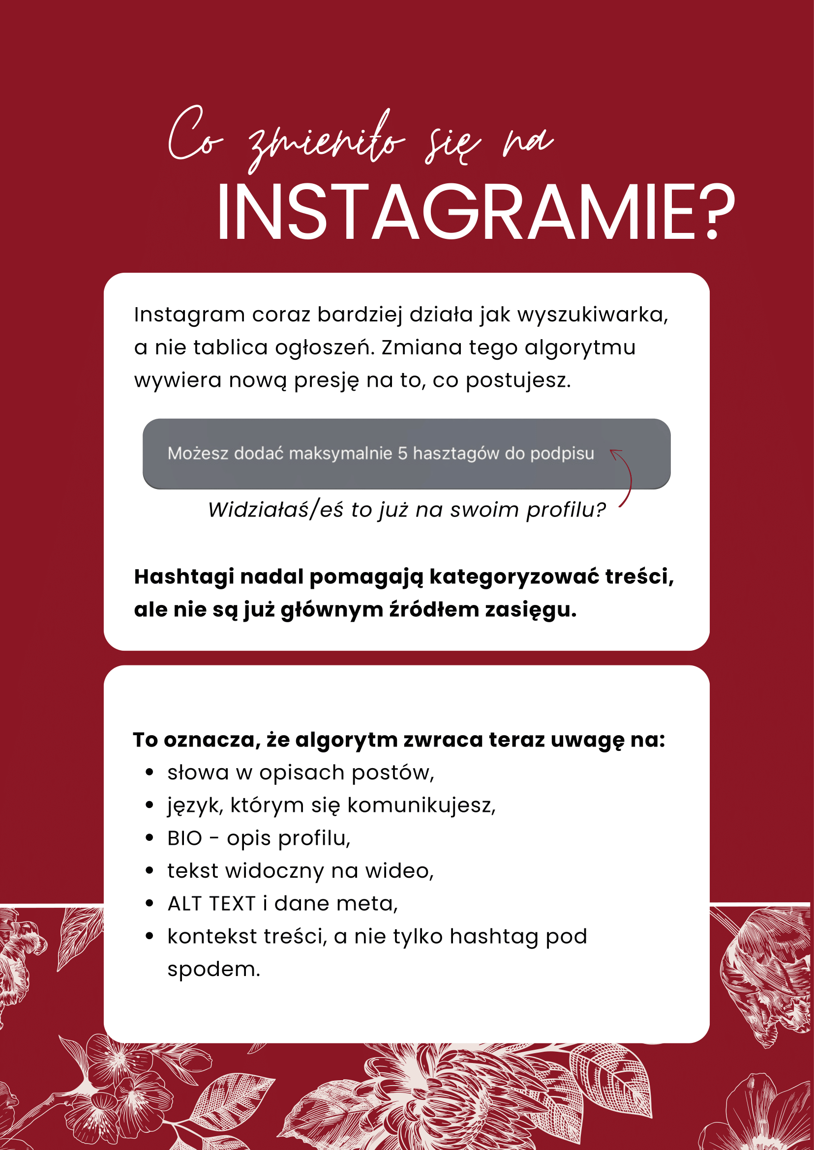 Praktyczny przewodnik po tym, jak działa dziś Instagram jako wyszukiwarka. Dowiesz się, jak pisać opisy, napisy w rolkach i stories tak, żeby algorytm rozumiał Twoje treści i pokazywał je właściwym osobom. Nauczysz się używać słów kluczowych, social SEO i hashtagów w nowoczesny sposób – bez zgadywania i bez „ładnego, ale pustego” pisania.